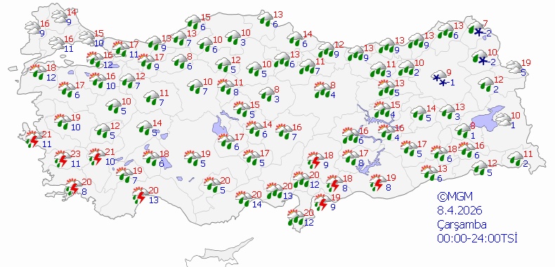 Türkiye genelinde 8 Nisan 2026 Çarşamba günü itibarıyla hava koşulları oldukça hareketli ve riskli bir tablo ortaya koyuyor. Meteoroloji Genel Müdürlüğü’nün yayımladığı güncel haritalara göre yurt genelinde sağanak yağışlar geniş bir alana yayılırken, bazı bölgelerde kuvvetli yağış, fırtına ve yüksek kesimlerde kar yağışı ihtimali öne çıkıyor.