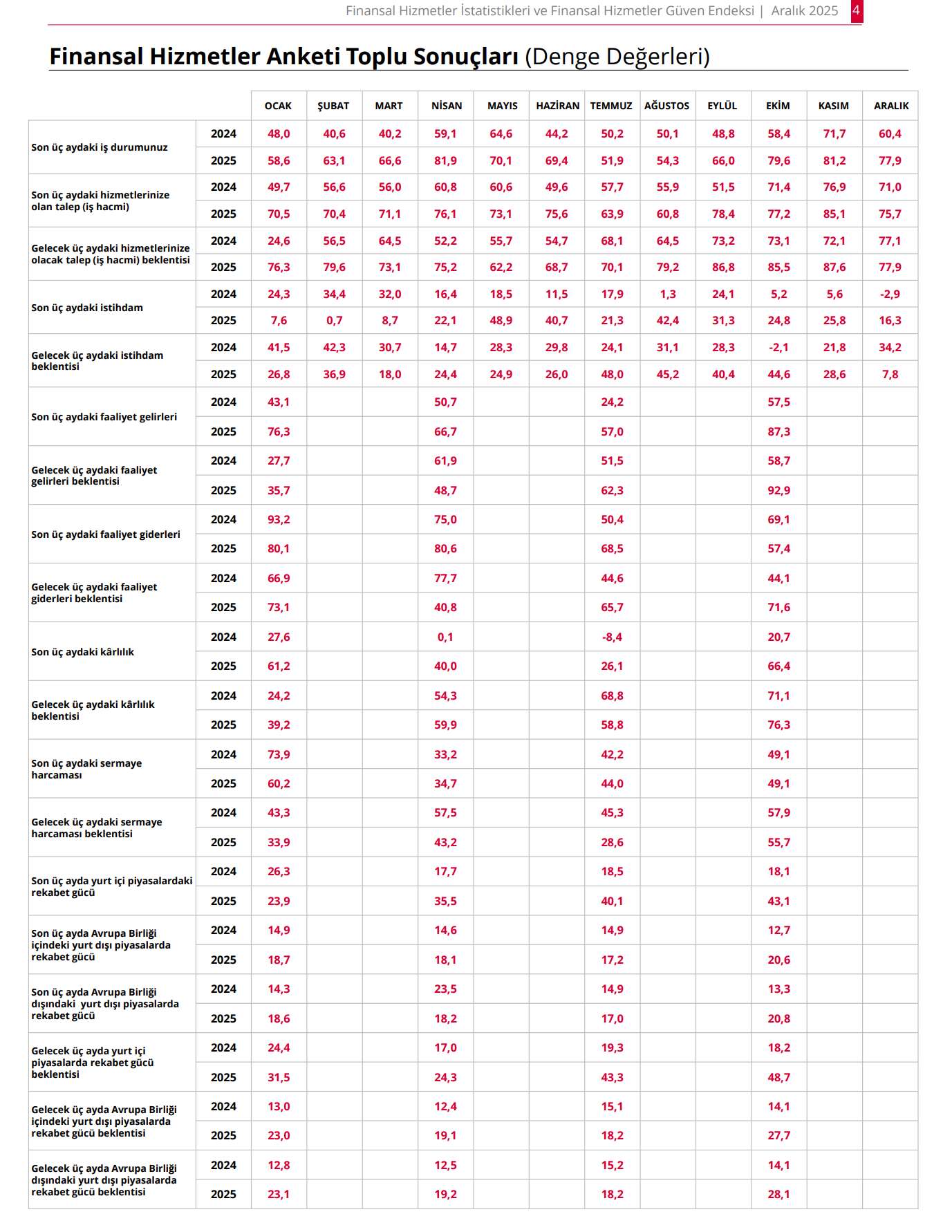 TCMB Finansal Hizmetler Güven Endeksi, aralık ayında bir önceki aya göre 7,4 puan azalış kaydederek 177,2 seviyesinde gerçekleşti. Endeksi oluşturan anket sorularına ait yayılma endeksleri incelendiğinde, gelecek üç aydaki hizmetlere olan talep beklentisi, son üç aydaki hizmetlere olan talep ve son üç aydaki iş durumu olmak üzere tüm alt endekslerin FHGE’yi azalış yönünde etkilediği görüldü.