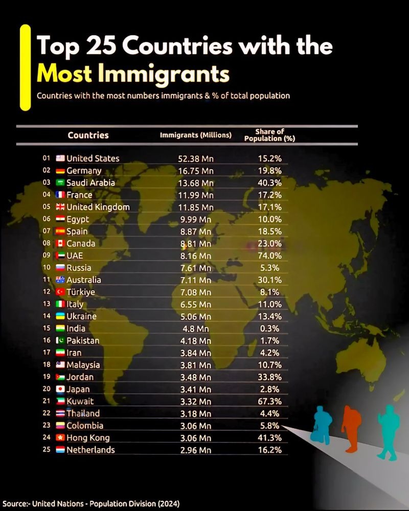 Türkiye, 7,08 milyon göçmenle 12. sırada kendine yer buldu. Bu rakam, toplam nüfusun yüzde 8,1’ine karşılık geliyor. Kanada’da göçmen oranı yüzde 23’e, Avustralya’da ise yüzde 30’a ulaştı. Küçük nüfuslu ülkelerde göçmenlerin payı giderek belirleyici hale geliyor. Özellikle Kuveyt (%67,3) ve Hong Kong (%41,3) gibi bölgelerde göçmenler, nüfusun neredeyse yarısını oluşturuyor.