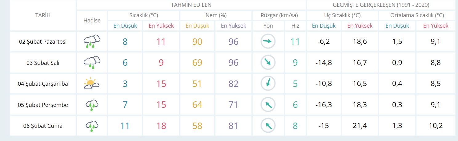 Salı günü yağış sürecek ancak hava sıcaklıklarında hafif bir gerileme görülecek. En yüksek sıcaklık 9 derece civarında kalırken, gece saatlerinde 6 dereceye kadar düşüş yaşanabilir. Çarşamba günü ise parçalı bulutlu bir gökyüzü bekleniyor. Güneş yüzünü gösterse de sabah saatleri serin olacak.