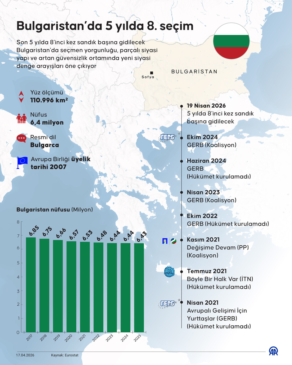 Komşu ülke Bulgaristan, uzun süredir devam eden siyasi kriz ve hükümet kurma sorunlarının ardından bir kez daha genel seçim için sandık başına gidiyor. Son 5 yıldır devam eden siyasi istikrarsızlık döngüsünden çıkmak isteyen Bulgaristan’da seçmenler yarın sandık başına gidecek. Ülkede son 5 yıl içinde tam 8’inci kez seçim yapılacak olması, Avrupa siyasetinde dikkat çeken gelişmeler arasında yer aldı. Yaklaşık 6,5 milyon kayıtlı seçmen, 240 sandalyeli parlamentonun yeni üyelerini belirlemek üzere oy kullanacak.