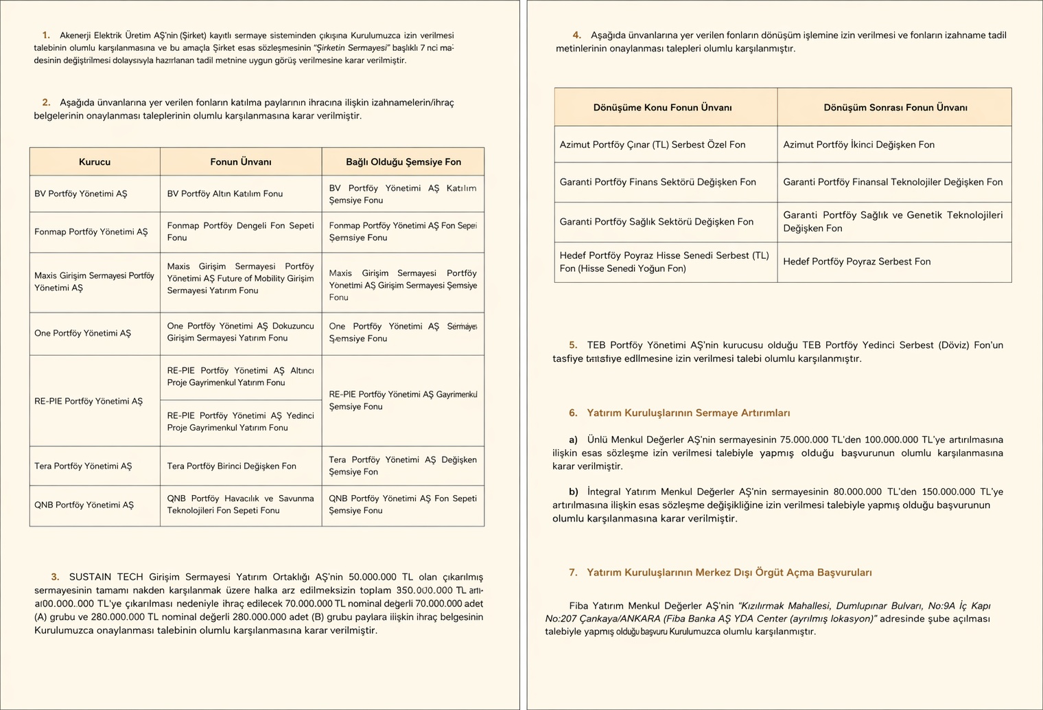 Kurul kararları kapsamında bazı mevcut fonlarda dönüşüm süreci de yaşandı. Azimut Portföy Çınar (TL) Serbest Özel Fon’un unvanı İkinci Değişken Fon olarak değiştirildi.