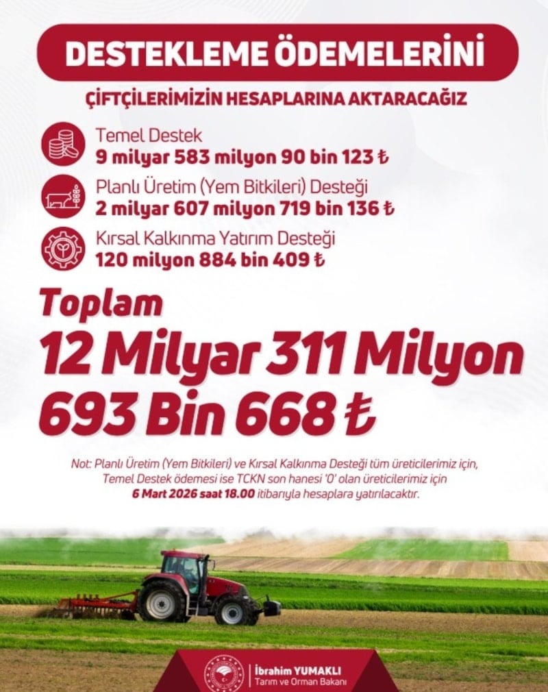 Toplam 12 milyar 311 milyon 693 bin 668 liralık tarımsal destekleme ödemesi bugün itibarıyla çiftçilerin hesaplarına aktarılacak.